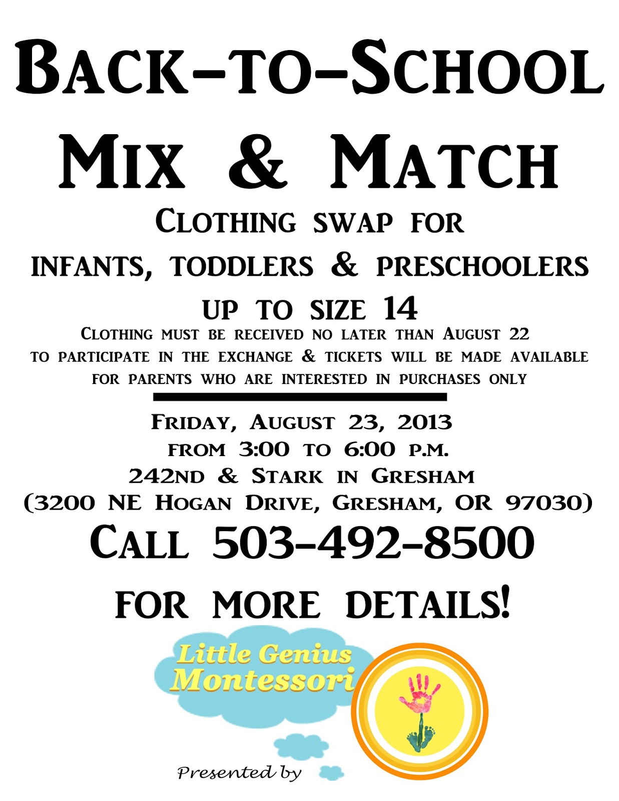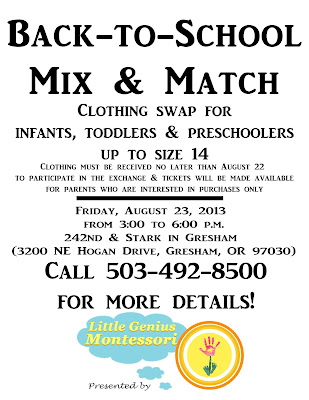 Back-to-School Mix & Match clothing swap on Friday, August 23 from 3:00-6:00 p.m. for infants, toddlers & preschoolers up to size 14. Contact us for more details!