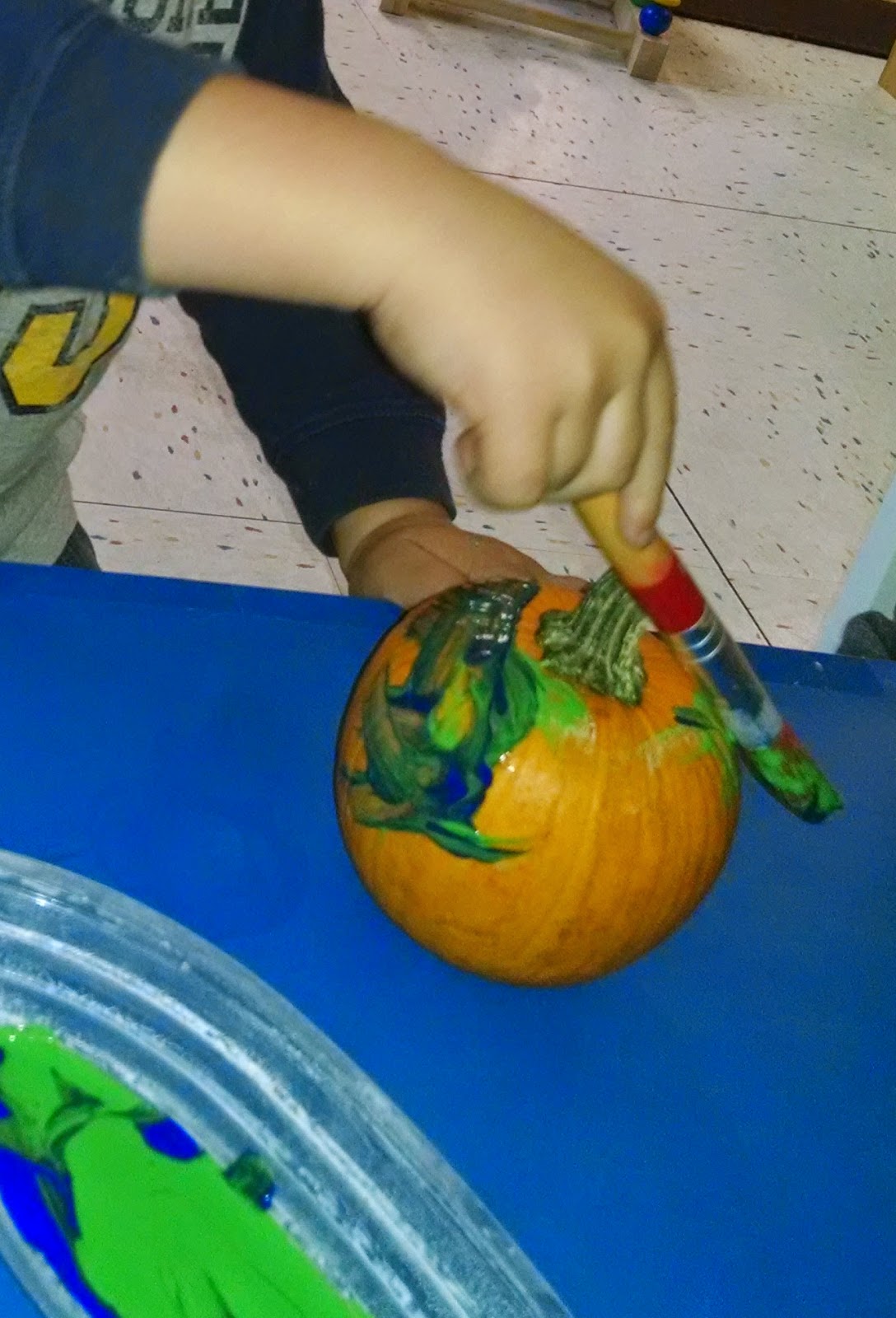 Our toddlers painted small pumpkins with paint brushes and their own fingers! They loved showing off the final product.